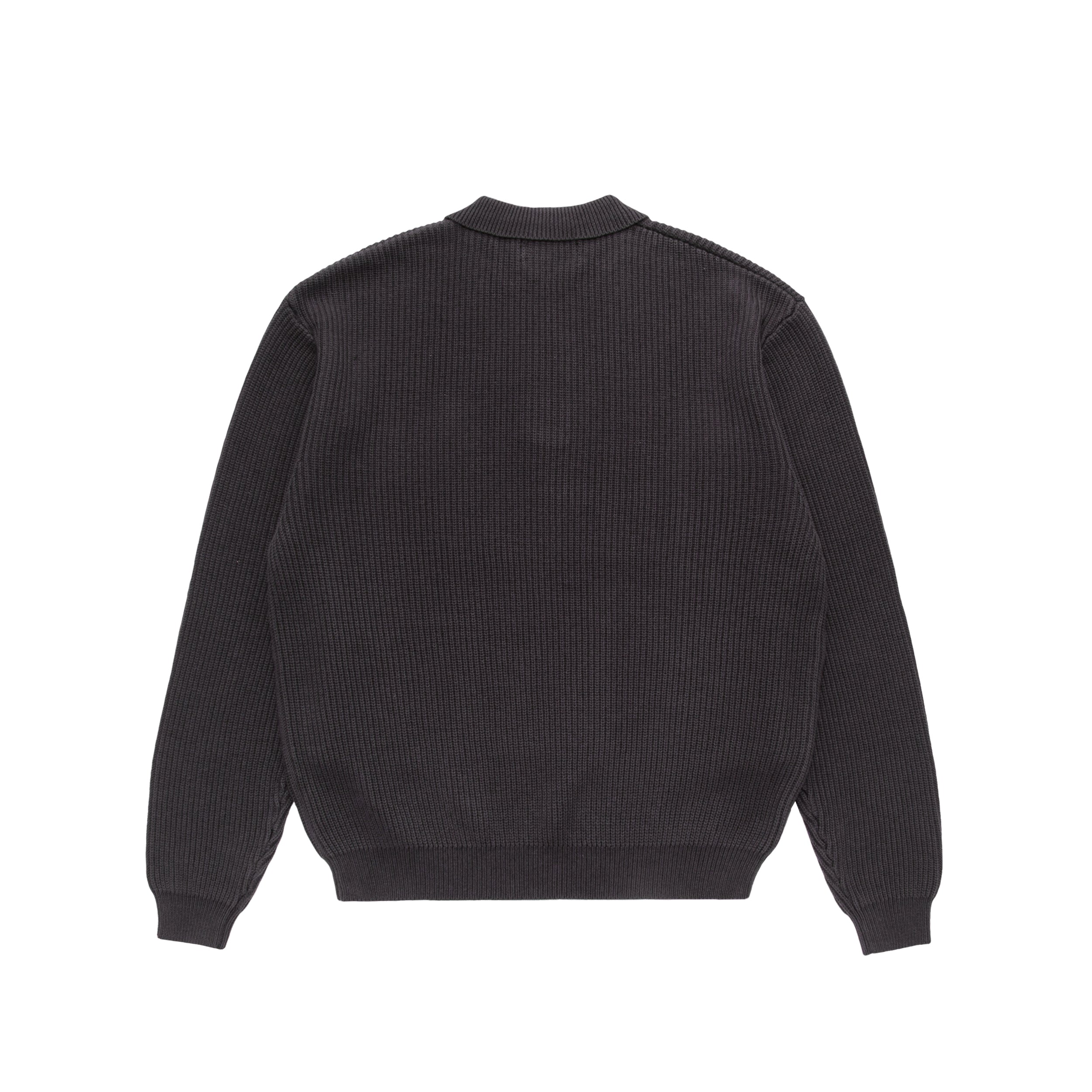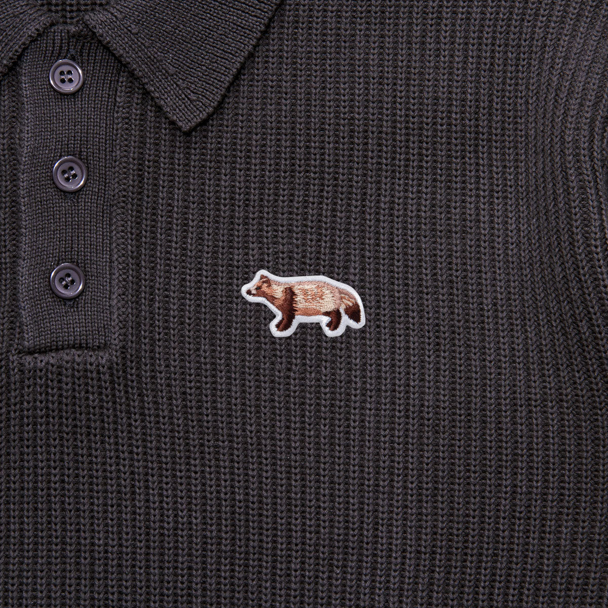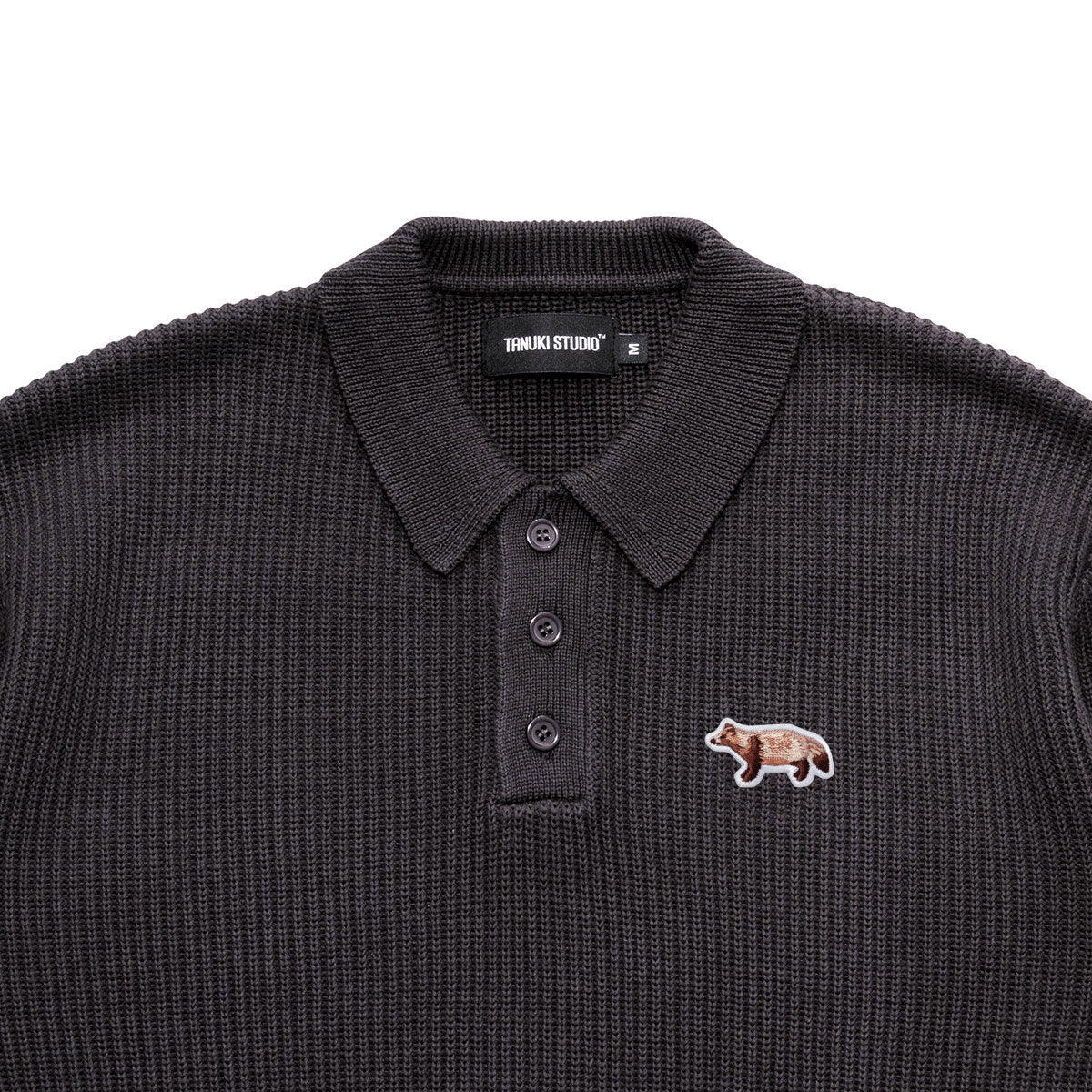 A knit polo shirt featuring an original front-facing tanuki patch, crafted with a sturdy, thick knit.