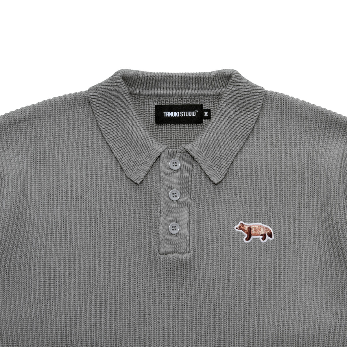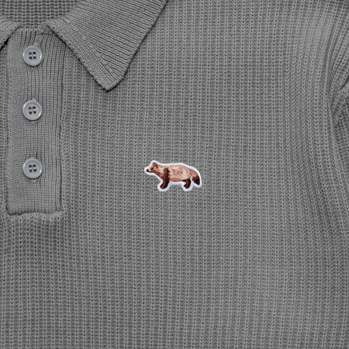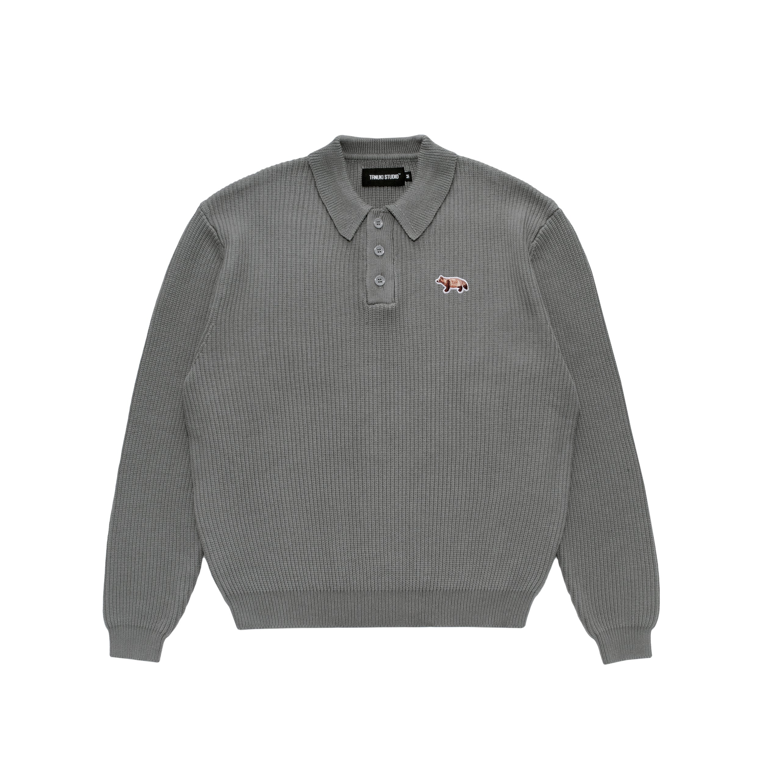 A knit polo shirt featuring an original front-facing tanuki patch, crafted with a sturdy, thick knit.