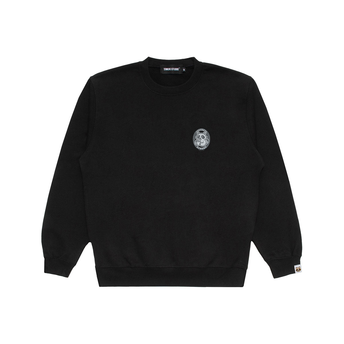 A tanuki tag adorns the sleeve end, and a TANUKI STUDIO tag is placed on the back hem.