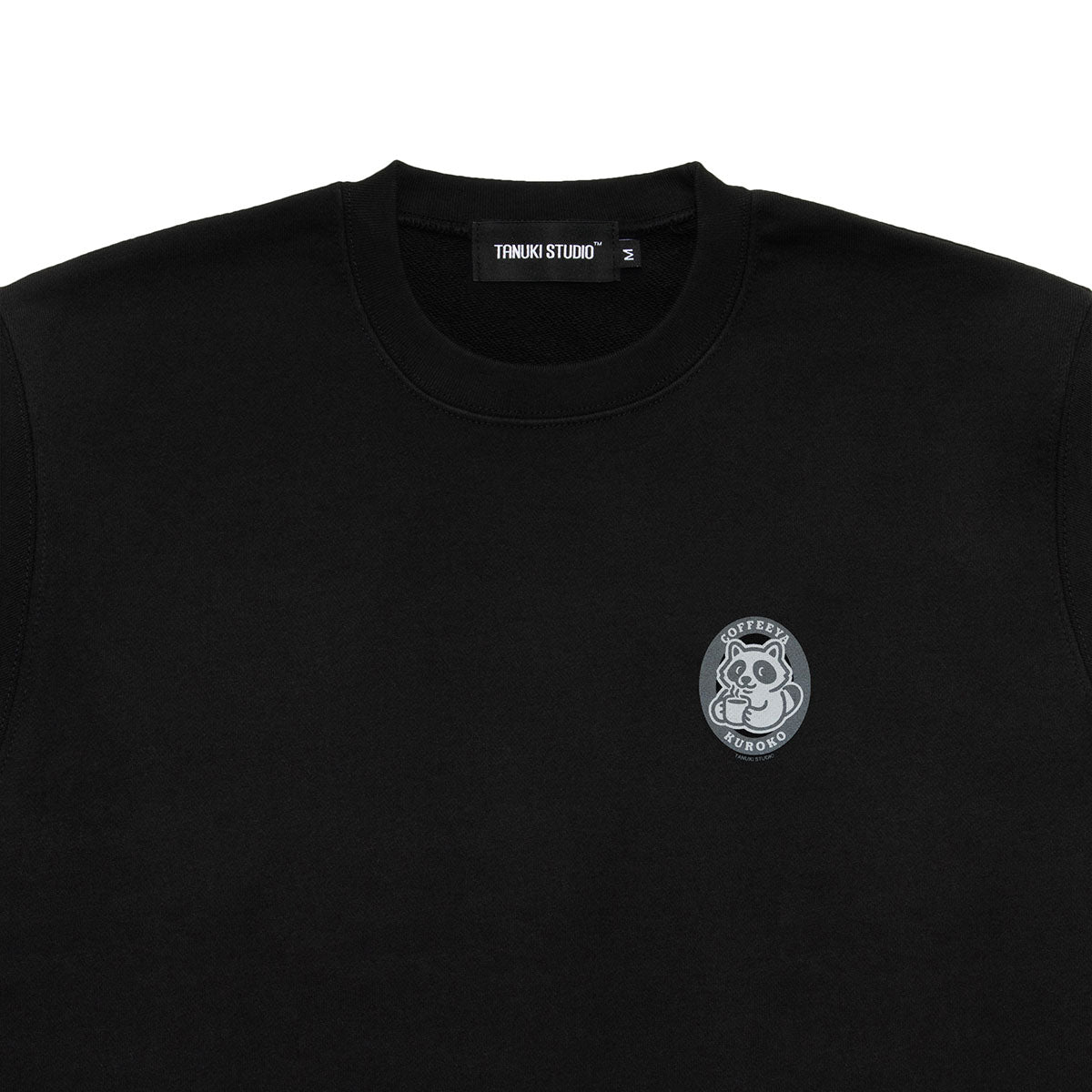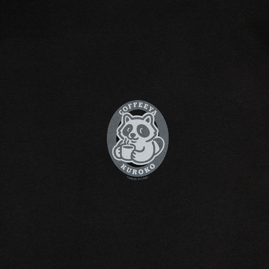The chest and back feature a graphic print of a tanuki enjoying coffee time.