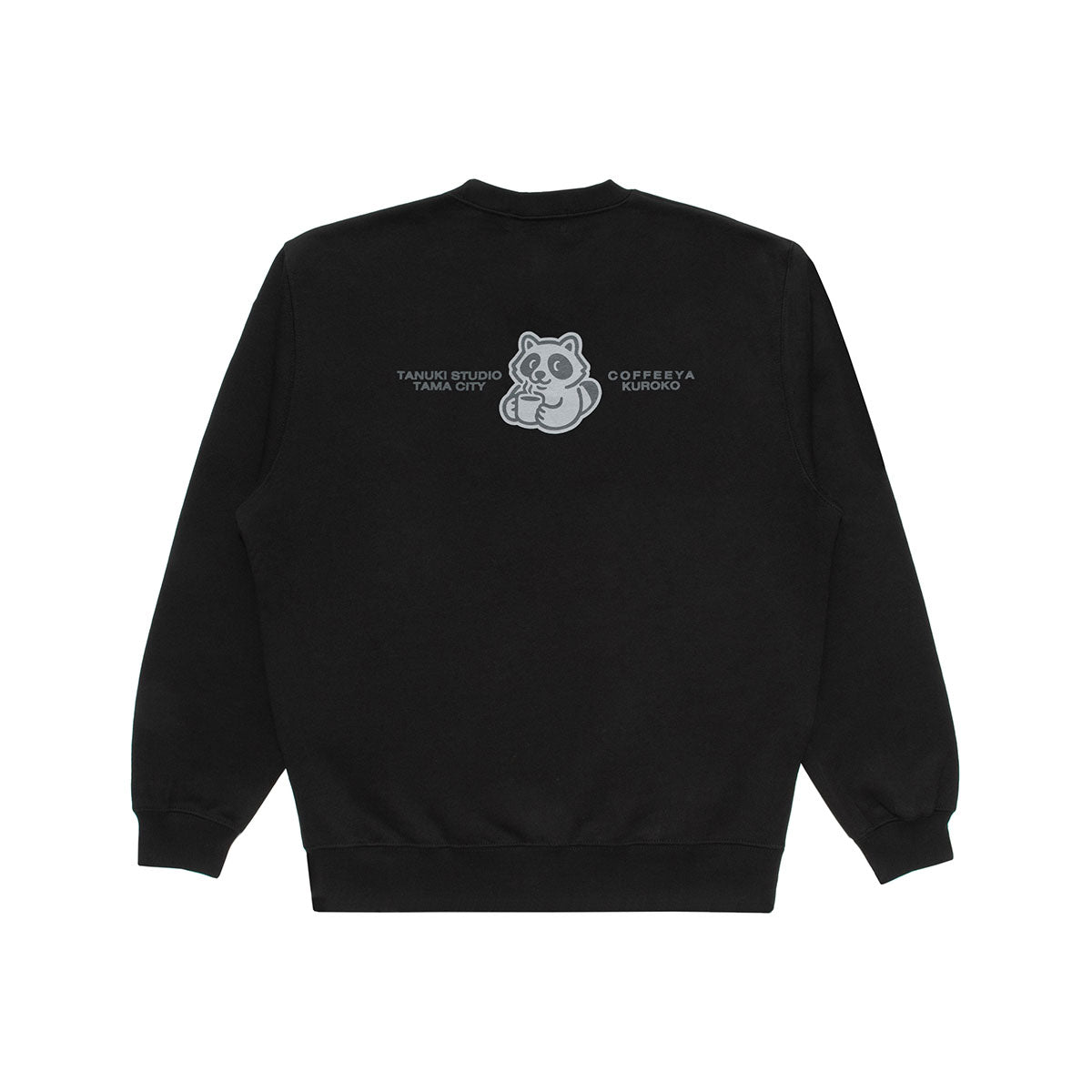 胸元と背中には、コーヒータイムを楽しむタヌキのグラフィックがプリントされています。