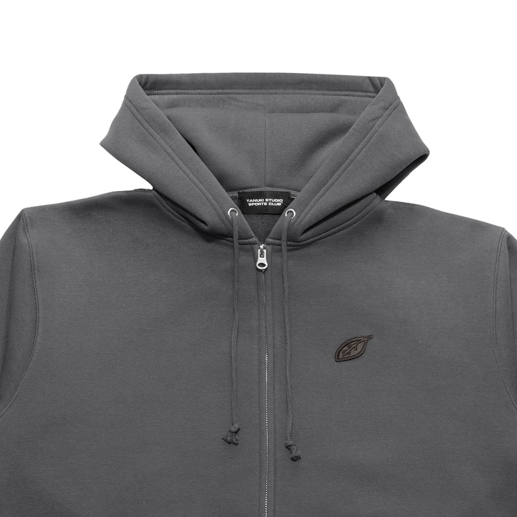 胸元に「タヌキが頭に葉っぱを乗せ、人に化けてスポーツをする」というイメージから着想しデザインした葉っぱのワッペンを付けた裏起毛素材のZip-Up フーディー(ジップアップパーカー)。