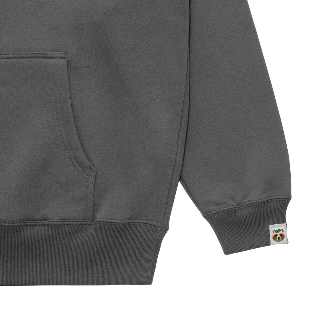 A Zip-Up hoodie sweatshirt featuring a leaf patch inspired by the image of a tanuki wearing leaves on its head, disguised as a human to play sports.