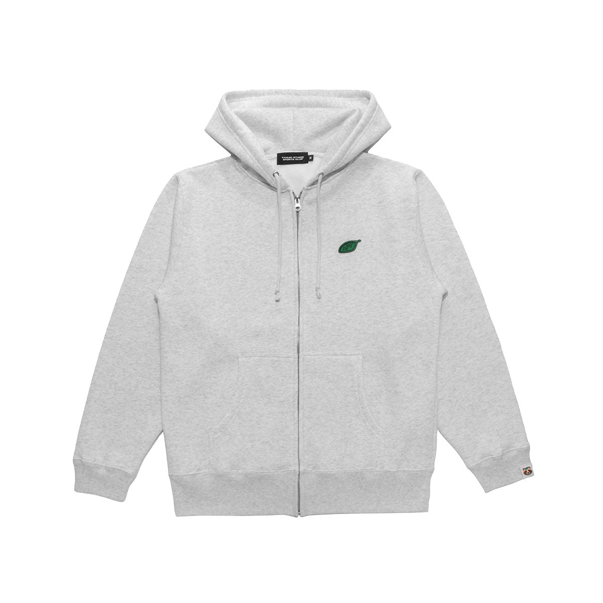 胸元に「タヌキが頭に葉っぱを乗せ、人に化けてスポーツをする」というイメージから着想しデザインした葉っぱのワッペンを付けた裏起毛素材のZip-Up フーディー(ジップアップパーカー)。