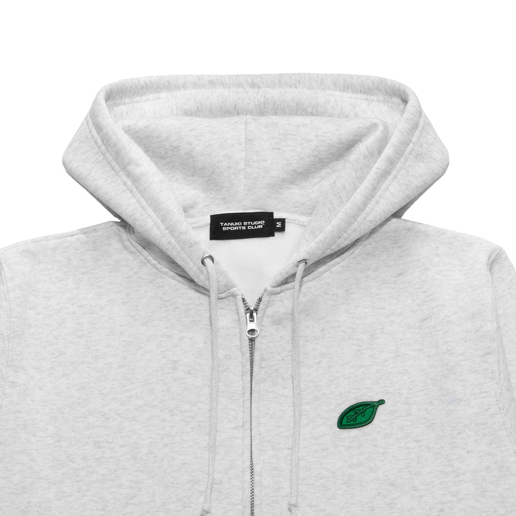 A Zip-Up hoodie sweatshirt featuring a leaf patch inspired by the image of a tanuki wearing leaves on its head, disguised as a human to play sports.