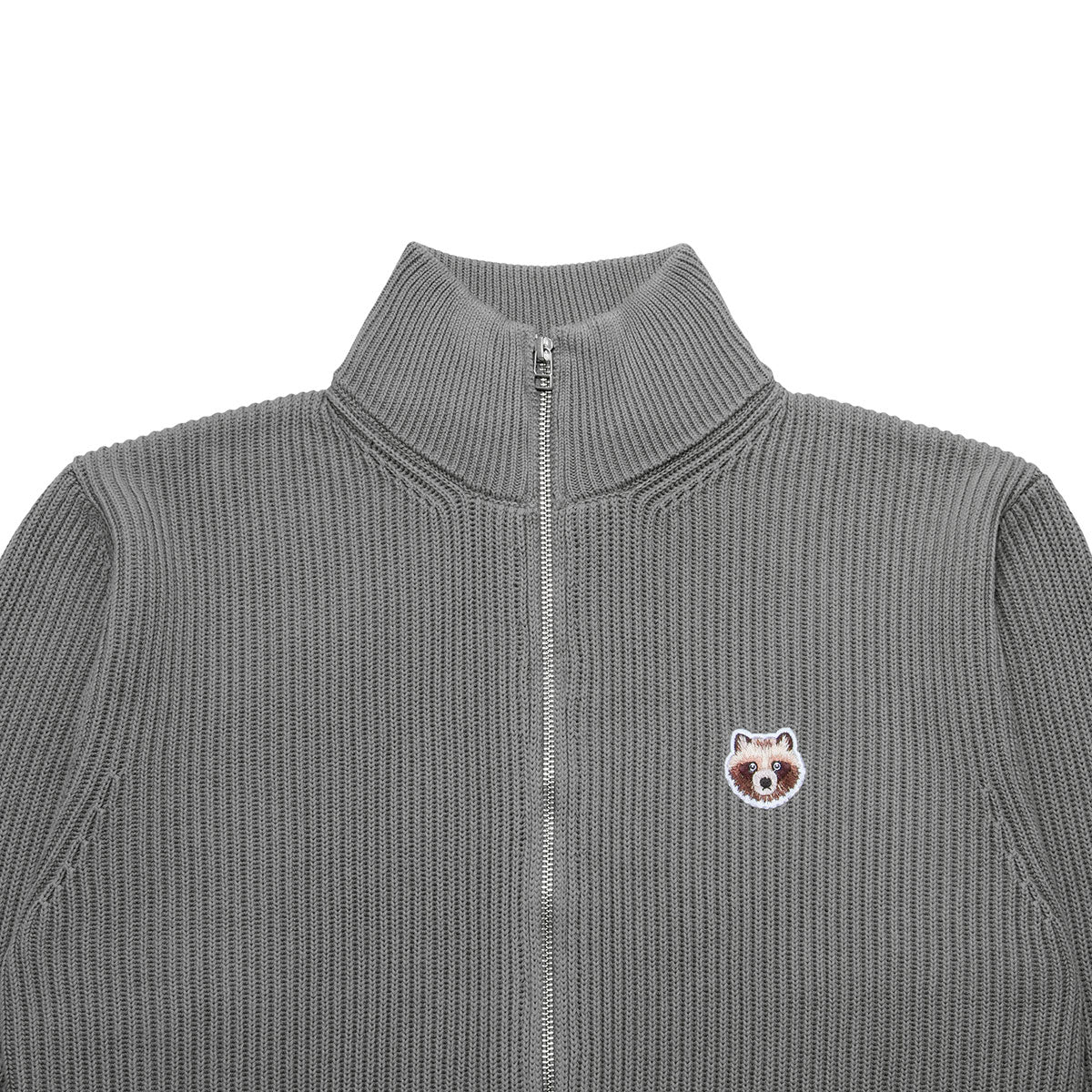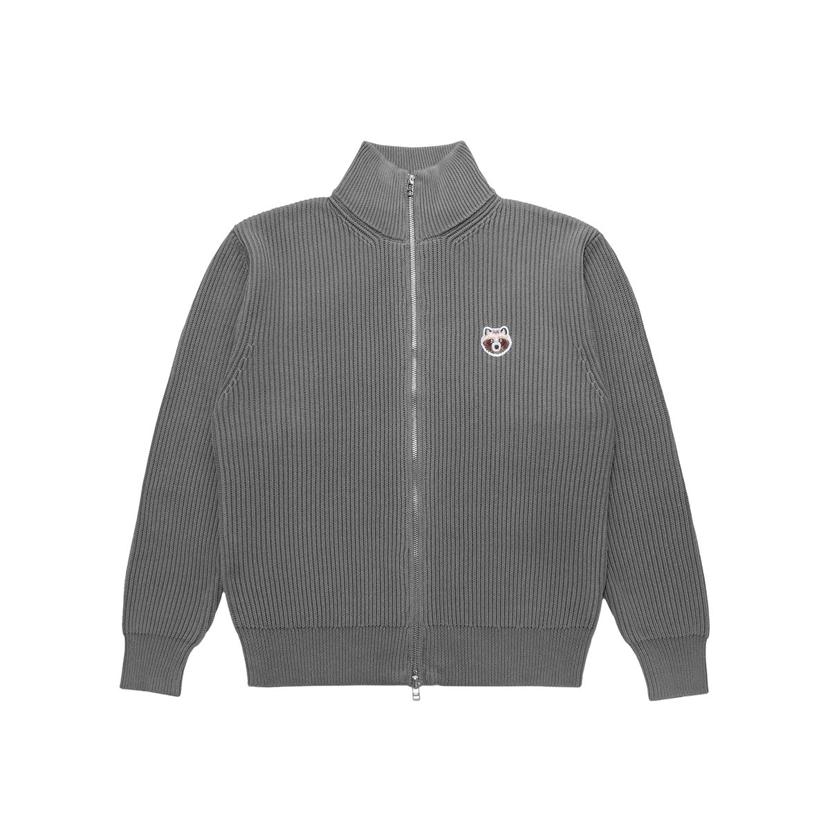 Driver's knit featuring a double zipper design, finished with a sturdy, thick knit and adorned with an original tanuki patch facing forward.