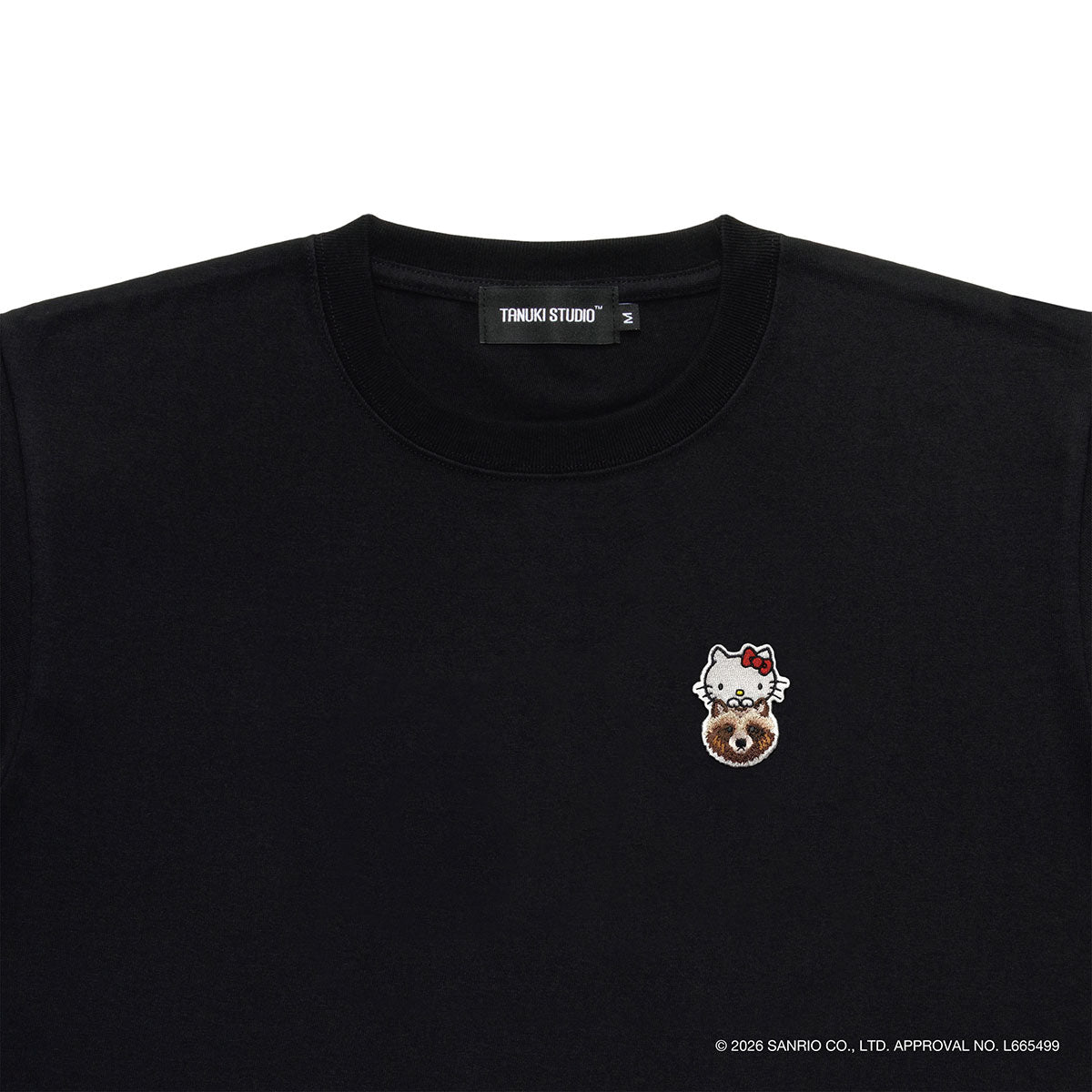 Featuring a patch design where Hello Kitty peeks out from atop a tanuki, this T-shirt boasts a TANUKI STUDIO signature style suitable for both men and women.
