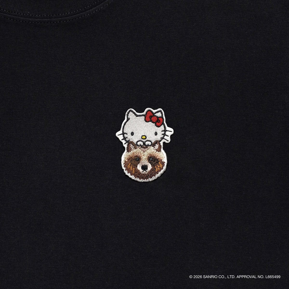 タヌキの上からキティちゃんが顔を出したデザインのワッペンを胸元に付けたTANUKI STUDIOらしい男女で着用しやすいデザインに仕上げました。