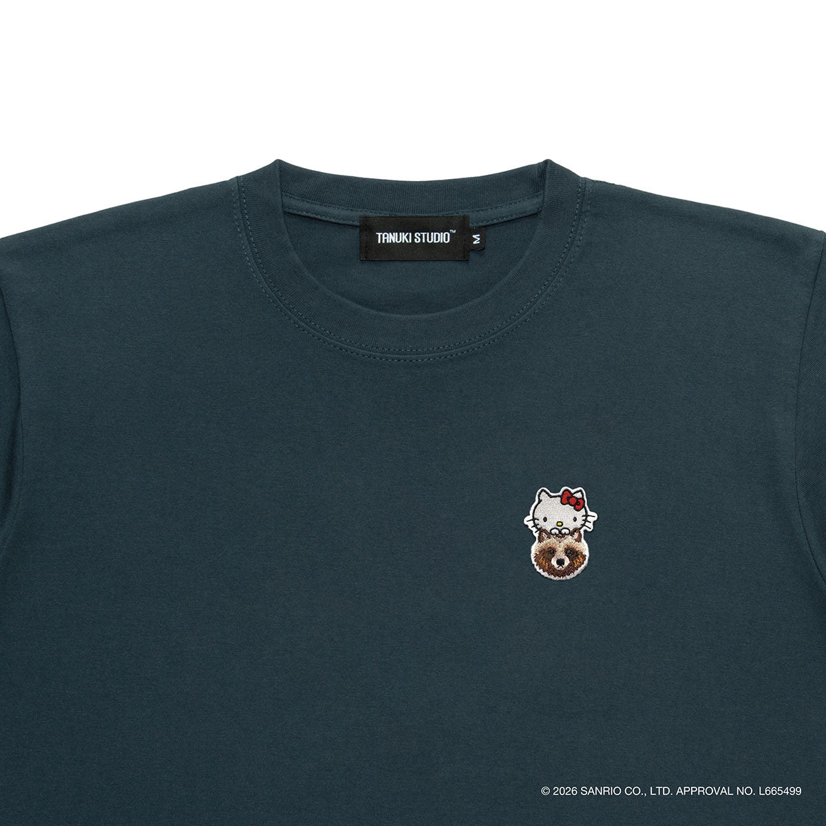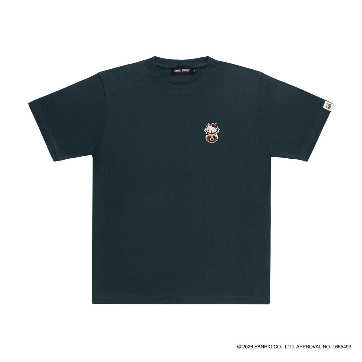 Featuring a patch design where Hello Kitty peeks out from atop a tanuki, this T-shirt boasts a TANUKI STUDIO signature style suitable for both men and women.
