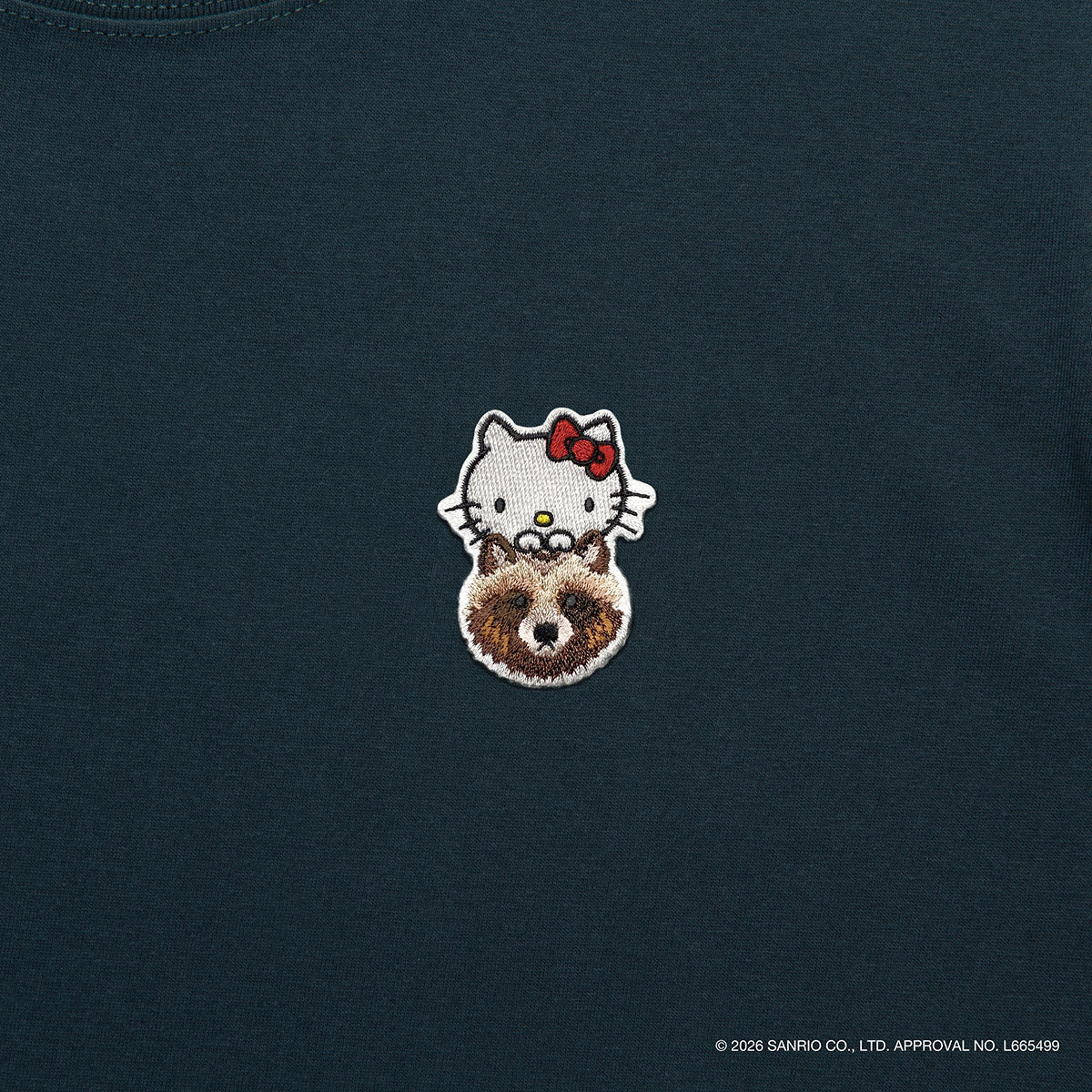 タヌキの上からキティちゃんが顔を出したデザインのワッペンを胸元に付けたTANUKI STUDIOらしい男女で着用しやすいデザインに仕上げました。
