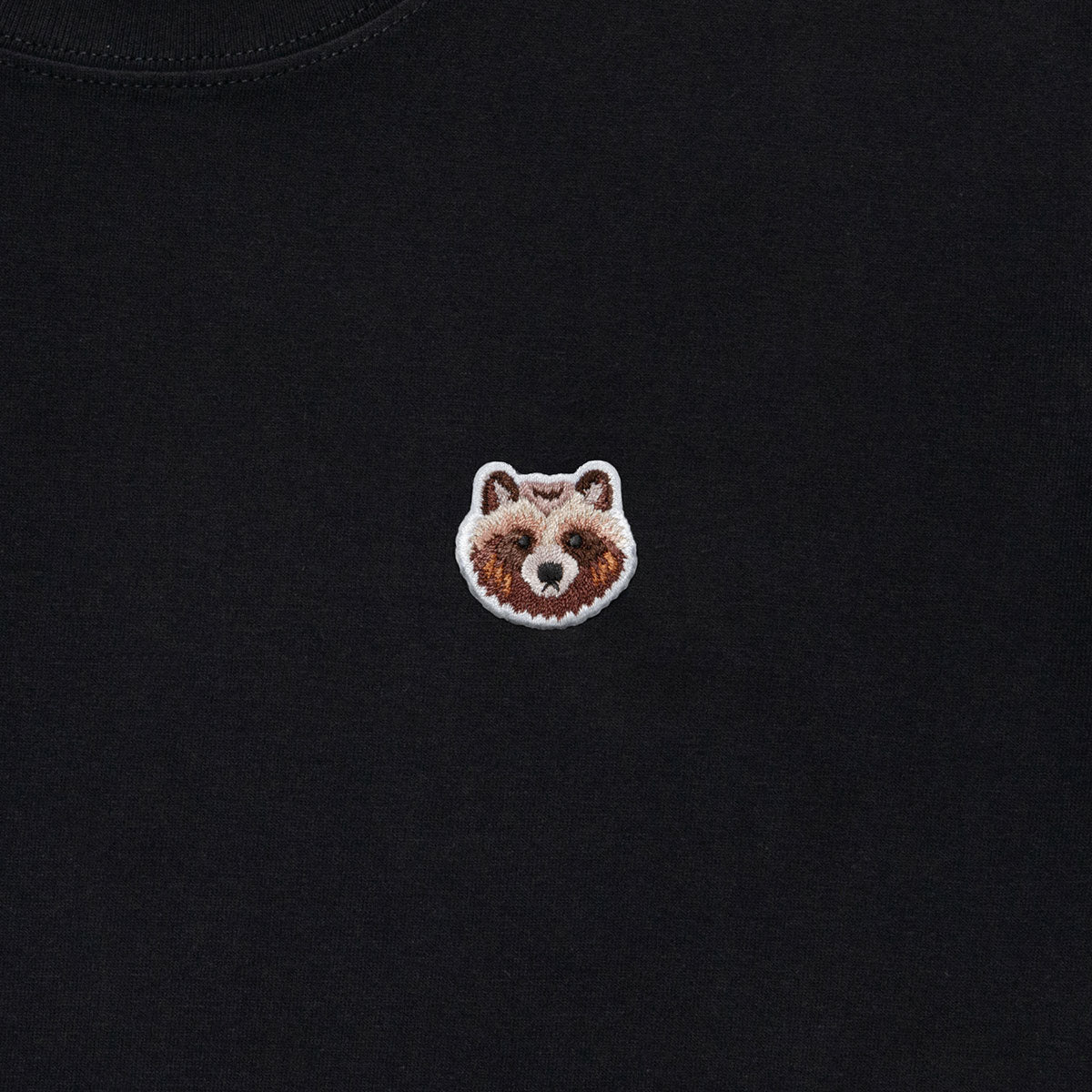 ミニ タヌキのワッペンを付けたユニセックス サイズのTシャツ。